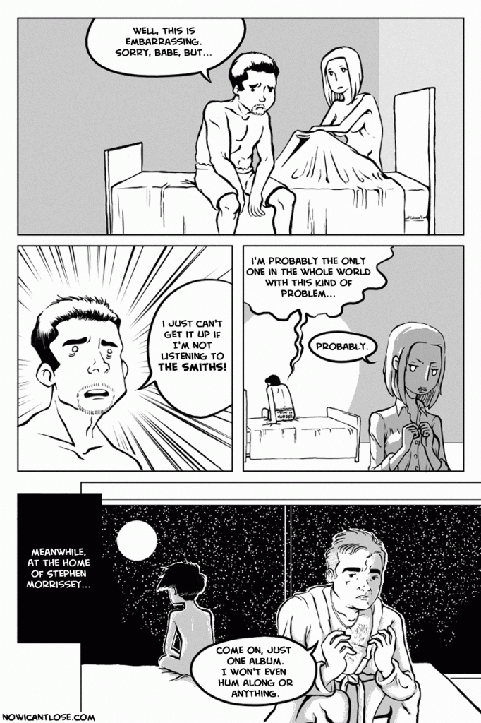 I went with an older Morrissey instead of a younger one, and I went with “listening to the Smith’s” instead of “listening to Morrissey,” but now I’m not so sure. Oh well. I guess that’s just how it goes sometimes.