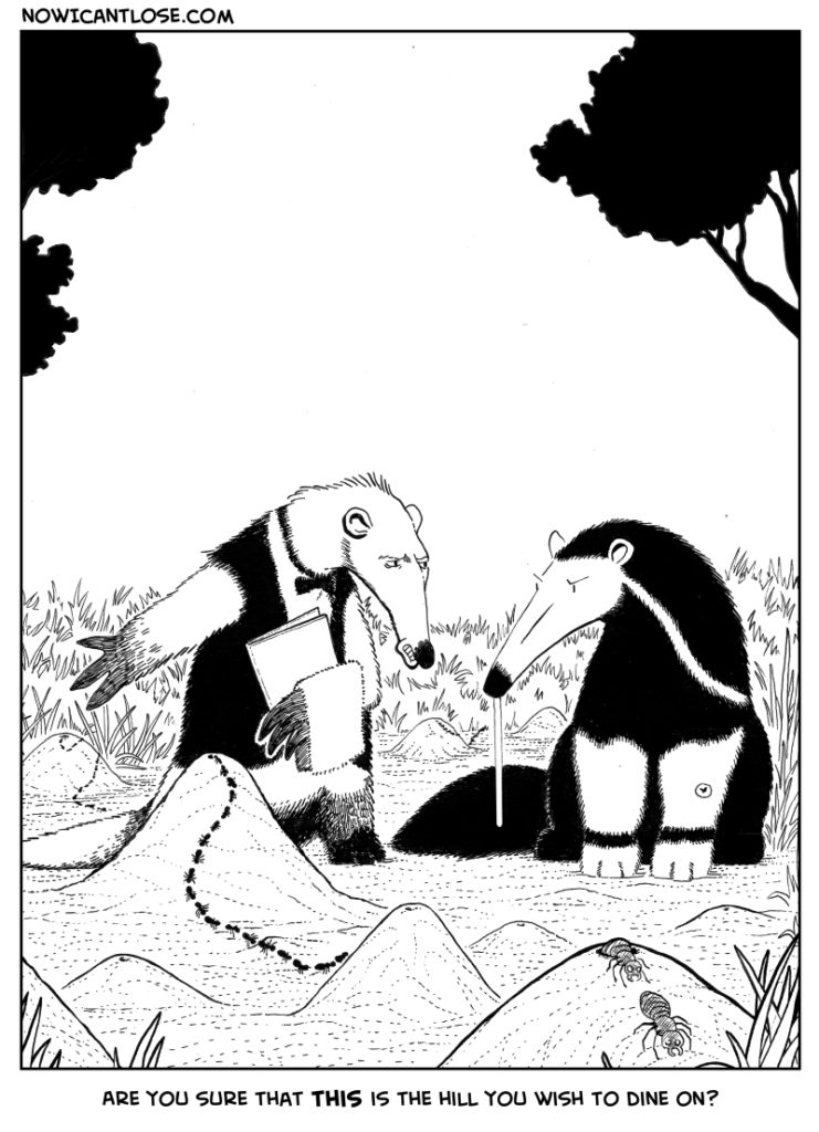 Scullduggery 131 Apr17 by Jack Scully on April 17, 2019 at 12:01 am Chapter: Comic Sometimes I think about re-categorizing these single-panel comics… └ Tags: 131, ant, anteater, hill, sculldugger, waiter 2 Comments