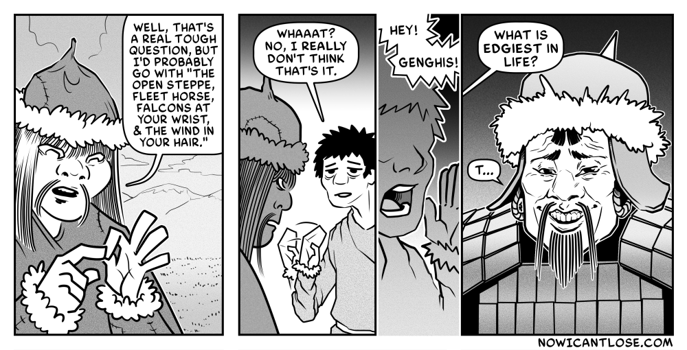 Sure, a lot of people are more familiar with the quote as attributed to Conan the Barbarian, but I came across it when reading about Genghis Khan. Besides, Conan’s version isn’t nearly as embarrassingly edgy, so… Anyway, I did some[…]↓ Read the rest of this entry…