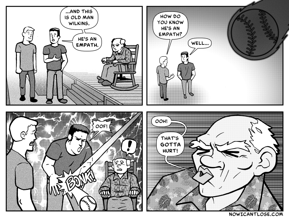 I spent a lot of time drawing the third panel, before coming up with a better way to tell the joke. Coincidentally, the third panel was a lot easier to draw after that.