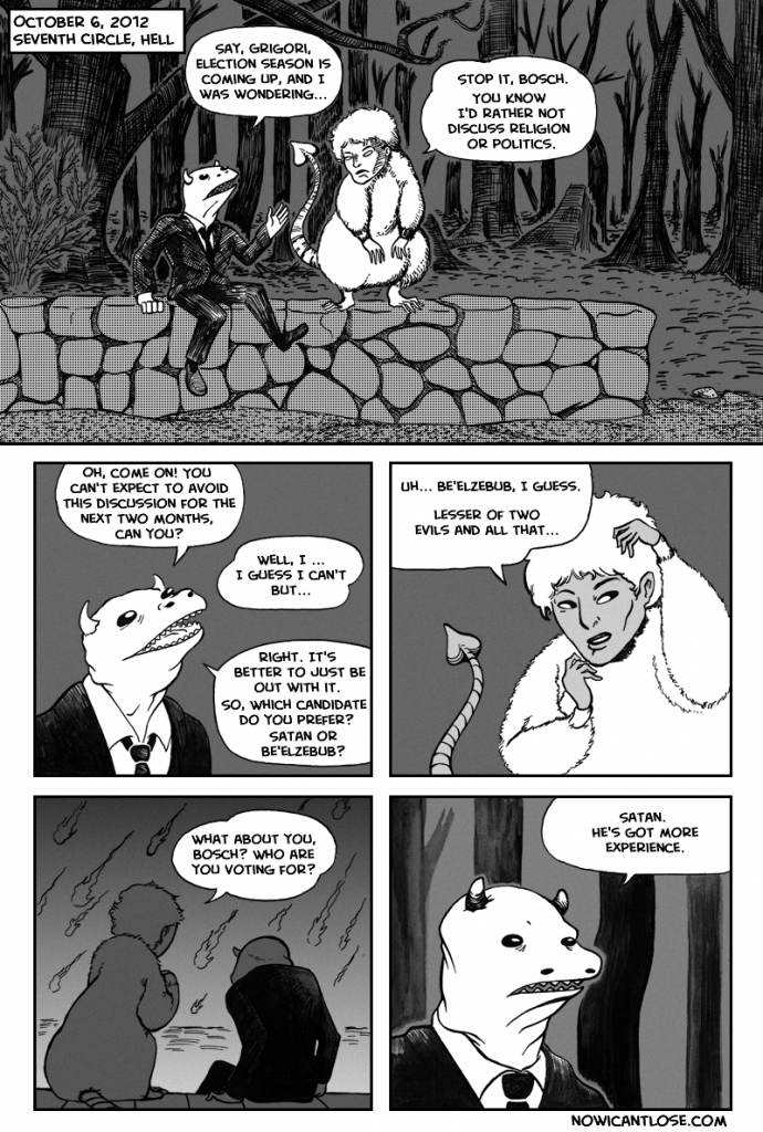 Here it is: a very special comic for this year’s American Presidential Election. Please cherish this occasion, as it only happens once every four years. Next week, I’ll resume updating on Wednesday. Want more comics about these two? Check out[…]↓ Read the rest of this entry…