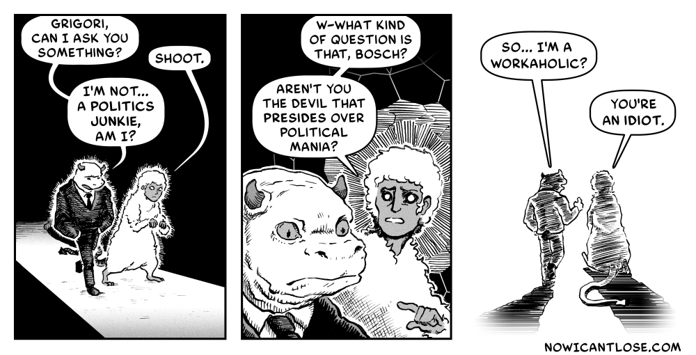Happy Valentine’s Day, everyone! I usually use Grigori, Salmacis, and Bosch (a.k.a. Sir Not-Appearing-in-This-Comic) in comics involving politics, but the last time I did that was way back in 2017, so I’m bringing them back for a comic about holidays.[…]↓ Read the rest of this entry…