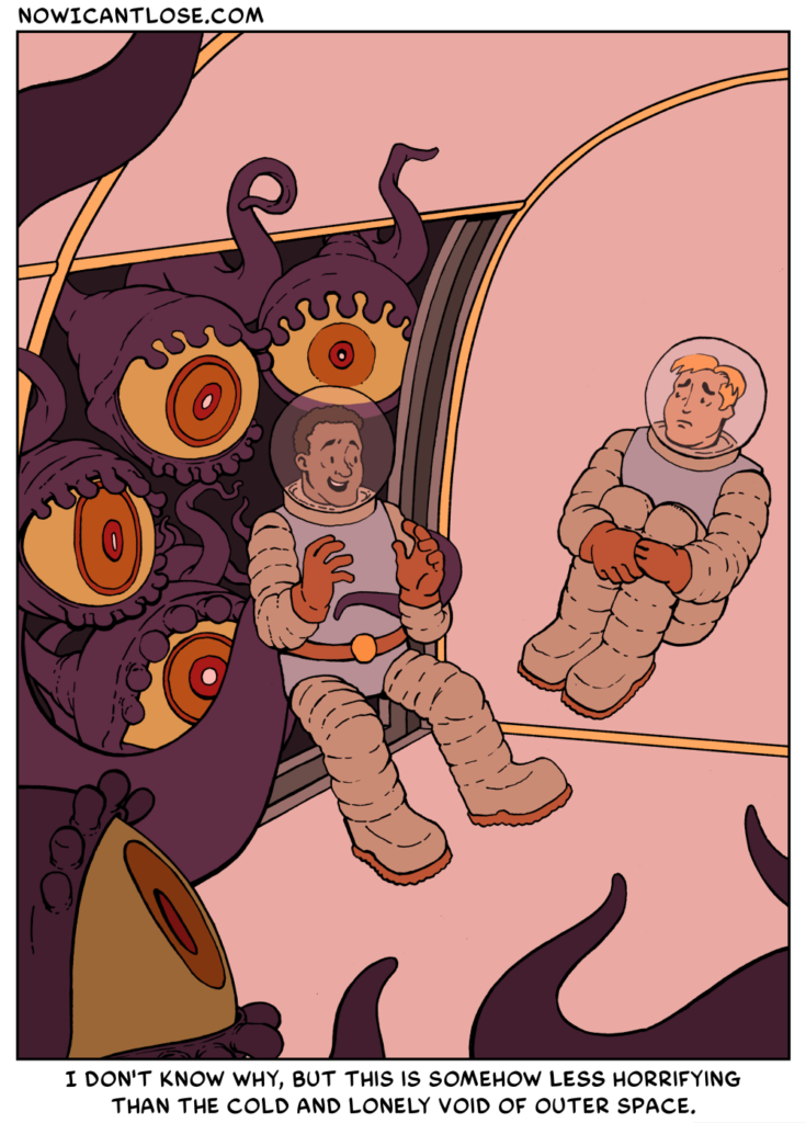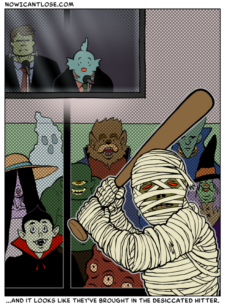 Hello, and welcome to October! This is the first of many horror-tinged comics that will be appearing this month. So far, most of my ideas for this month are single-panel comics, but I will endeavor to think of a few[…]↓ Read the rest of this entry…