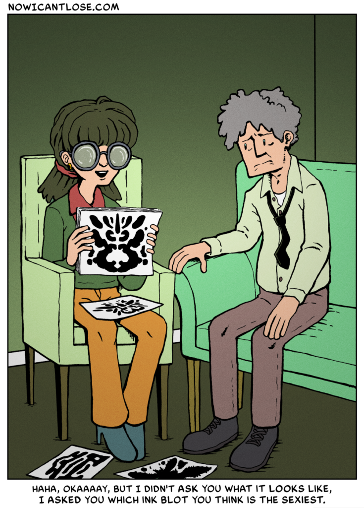 Do psychologists administer Rorschach tests anymore? I’d probably go to one if they do. It seems like it would be a blast. What is a Rorschach Test anyway? Want more comics about sexy ink blots psychology? >>Click Here!<<
