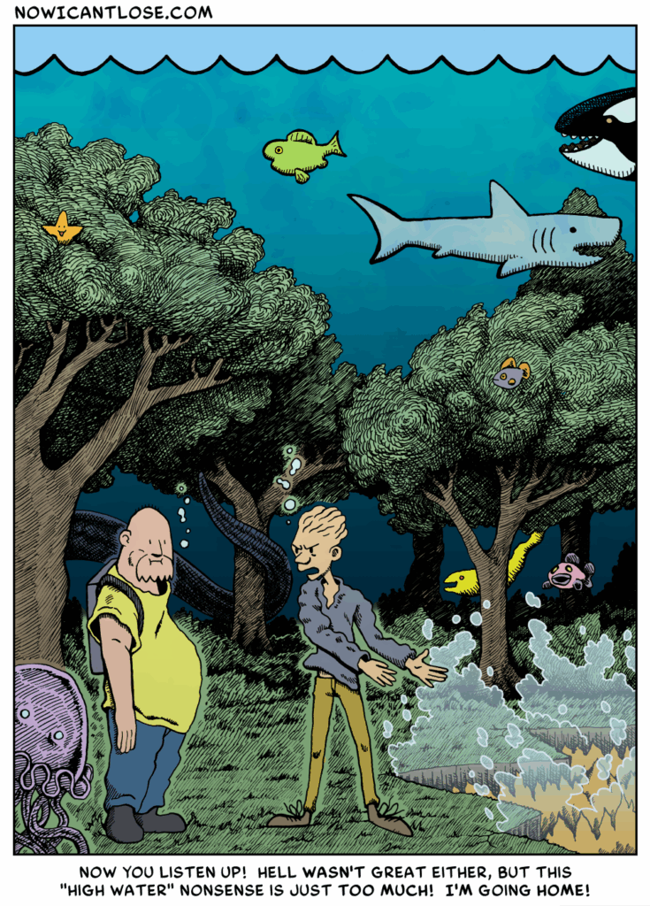 Today has been one of those “high water” days. That’s okay. The flowers need the rain. Want more comics about hell? >>Click Here!<< Want more comics about water? >>Not Sure How Many I’ve Got, But Knock Yourself Out!<<