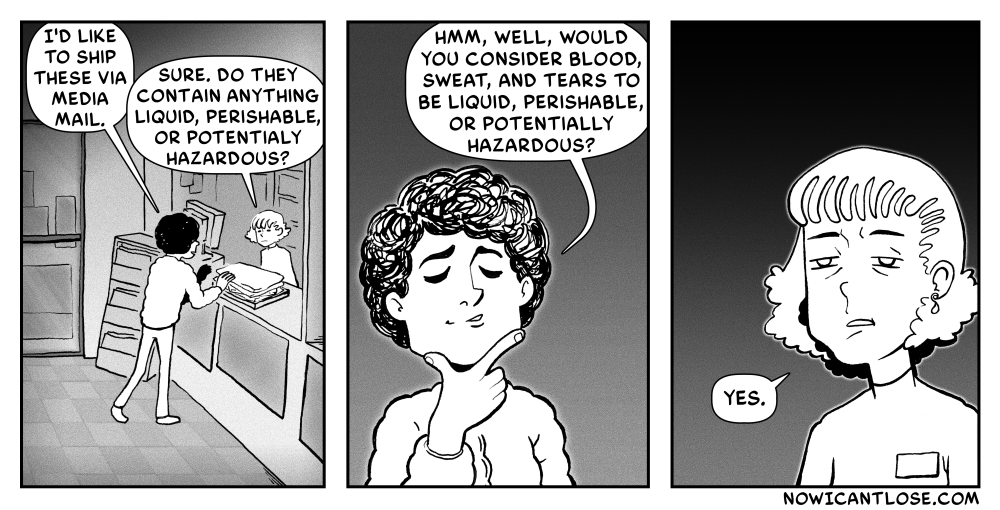 I haven’t been putting in the time adding tones to my comics lately! More work for the future, I guess. (Update: I came back and added tones.) Anyway, this comic has me in it. Loosely based on my experience shipping[…]↓ Read the rest of this entry…