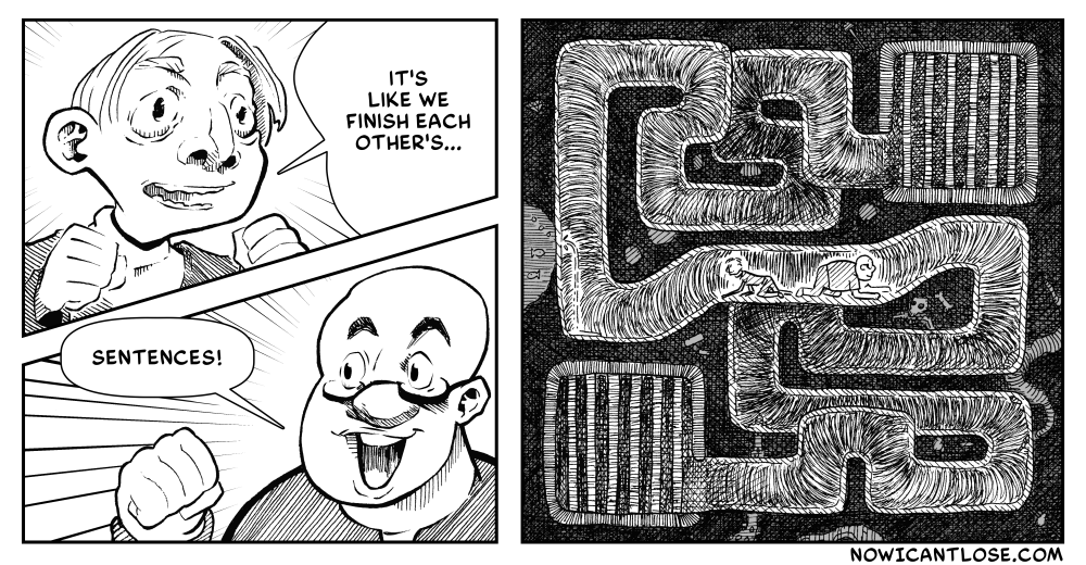 Quick heads, up, this week’s comic is going to be about a day late, since it’s two pages long and entirely cross-hatched. A little late, but what can you do? Nothing. See you Wednesday.
